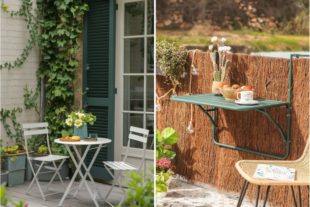 Una mesa y dos sillas plegables son la base de cualquier terraza con encanto. Este tipo de conjunto no solo es práctico —se guarda contra la pared cuando no se usa—, sino también un guiño al estilo de los cafés europeos: ideal para desayunar, tomar un té o leer al atardecer.