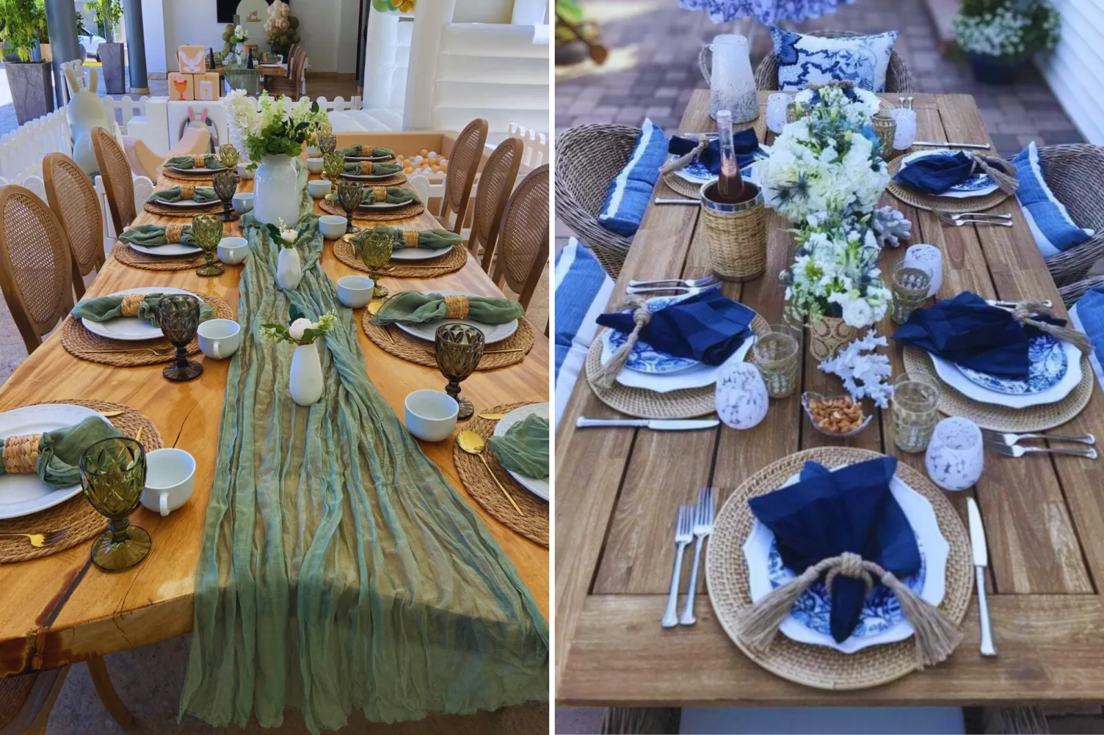 Más allá de los colores sólidos, los diseños que imitan acuarelas o combinan tonos pastel están ganando terreno para mesas festivas. Esta tendencia incorpora al azul cielo, rosa o lavanda, sea en textiles, servilletas o cristalería. Se crea una sensación artística y orgánica sin necesidad de recurrir al dorado o al blanco puro.