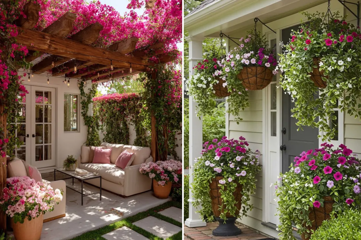 Cuando el espacio es limitado, mirar hacia arriba es clave. Las macetas colgantes —ya sea en la galería, en una pared o desde el techo— permiten sumar flores sin ocupar metros cuadrados. Las plantas colgantes con flores caídas aportan movimiento, color y un efecto visual súper atractivo. Si bien requieren un poco más de mantenimiento, el resultado vale la pena: alegría instantánea y un patio con personalidad.