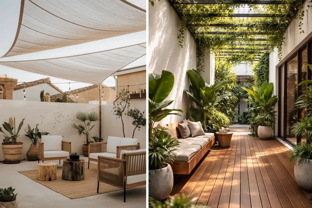 Para un estilo más natural, las cubiertas con cañas, mimbre o incluso plantas trepadoras generan sombra y protección liviana.