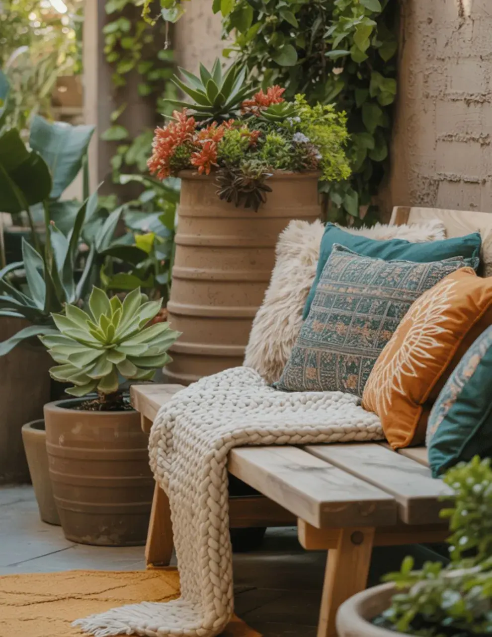 Los detalles marcan la diferencia: almohadones de telas suaves, mantas para las tardes frescas y cestos para guardar objetos ayudan a mantener todo ordenado y cálido. También podés combinar materiales y colores: la madera, el mimbre y los tonos tierra refuerzan la sensación de confort, mientras que accesorios prácticos como pequeñas mesas auxiliares o estanterías resistentes optimizan cada rincón del patio.