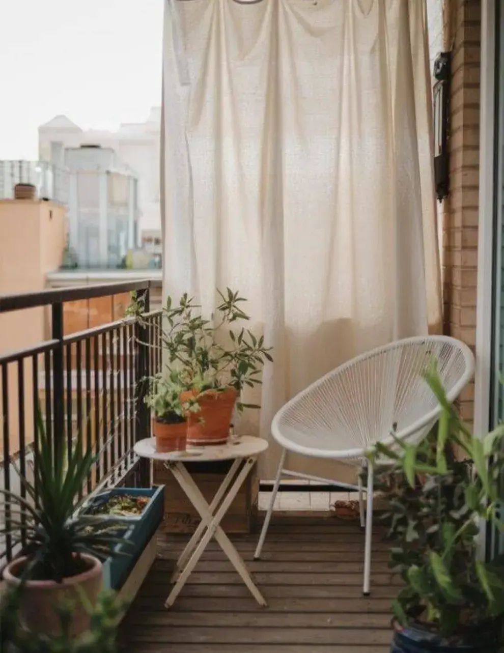Si no querés instalar nada, podés usar objetos altos (macetas grandes, cajas o muebles bajos) combinados con telas, mantas o faroles. Esto no solo tapa parcialmente la vista, sino que convierte tu balcón en un rincón cálido y acogedor, perfecto para leer, tomar algo o relajarte. Es una solución económica, flexible y fácil de revertir.