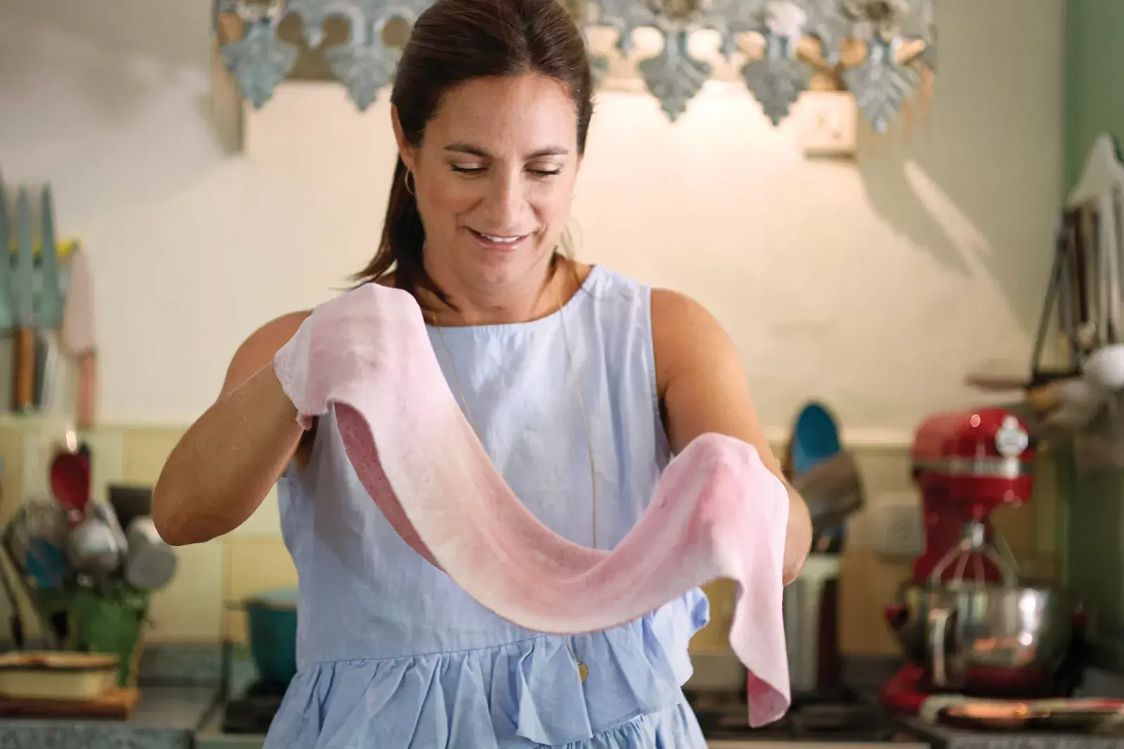 Hacer la masa de pasta colocando en un bowl la harina y la sal. Hacer un hueco en el centro y poner allí los huevos, el puré de remolacha y el aceite. Amasar un rato hasta que la masa esté lisa y homogénea. Dejarla descansar en la heladera para que se relaje.