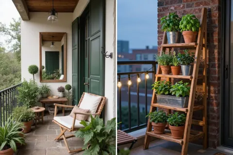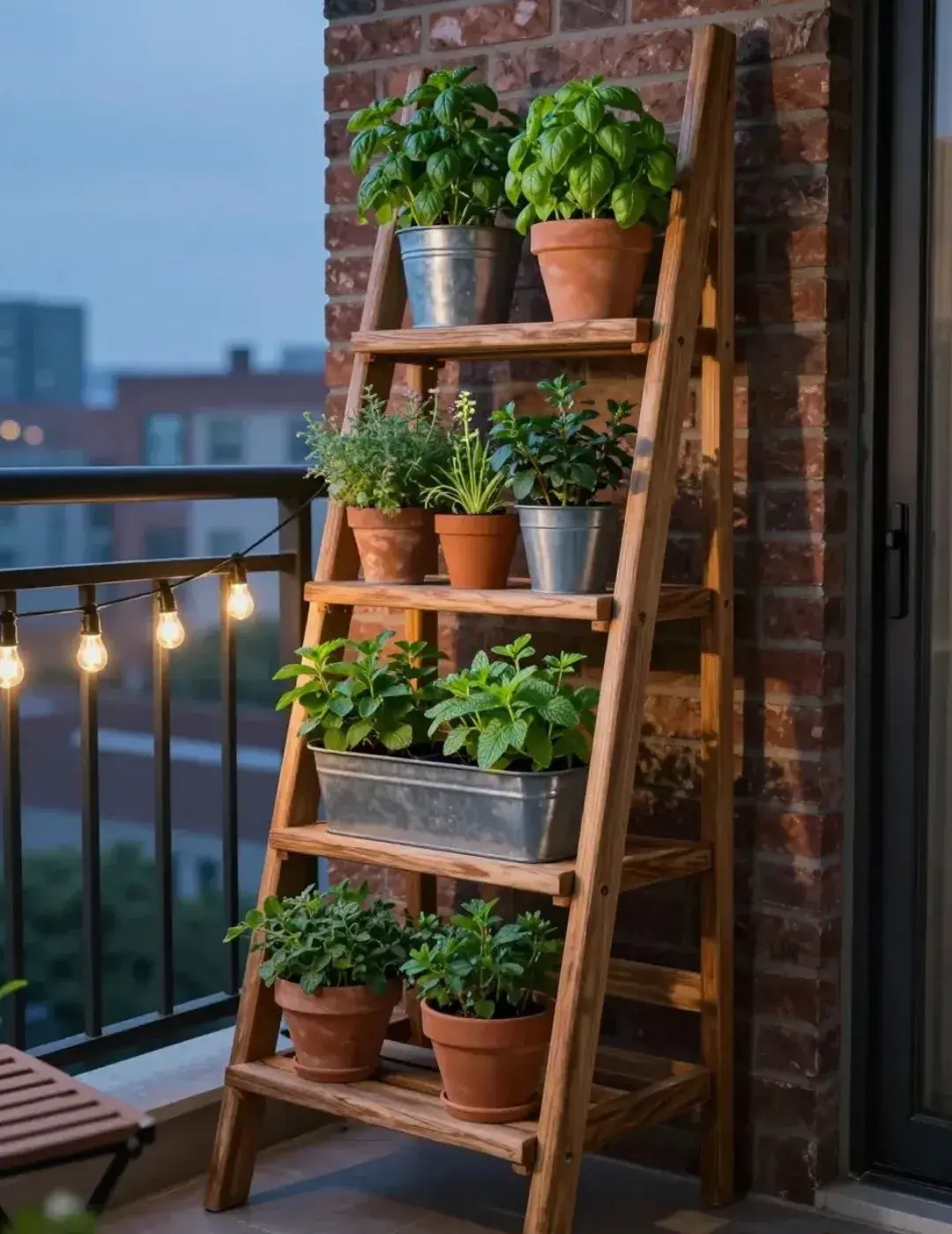En lugar de colgar macetas comunes, podés usar una escalera vieja o estantes escalonados para crear un mini jardín de hierbas aromáticas. Menta, albahaca, romero o lavanda no solo aportan color y textura, sino que también llenan el balcón de aromas frescos. Es un recurso funcional y decorativo al mismo tiempo: podés cortar las hierbas para cocinar o preparar infusiones, mientras el espacio se mantiene ordenado y atractivo.