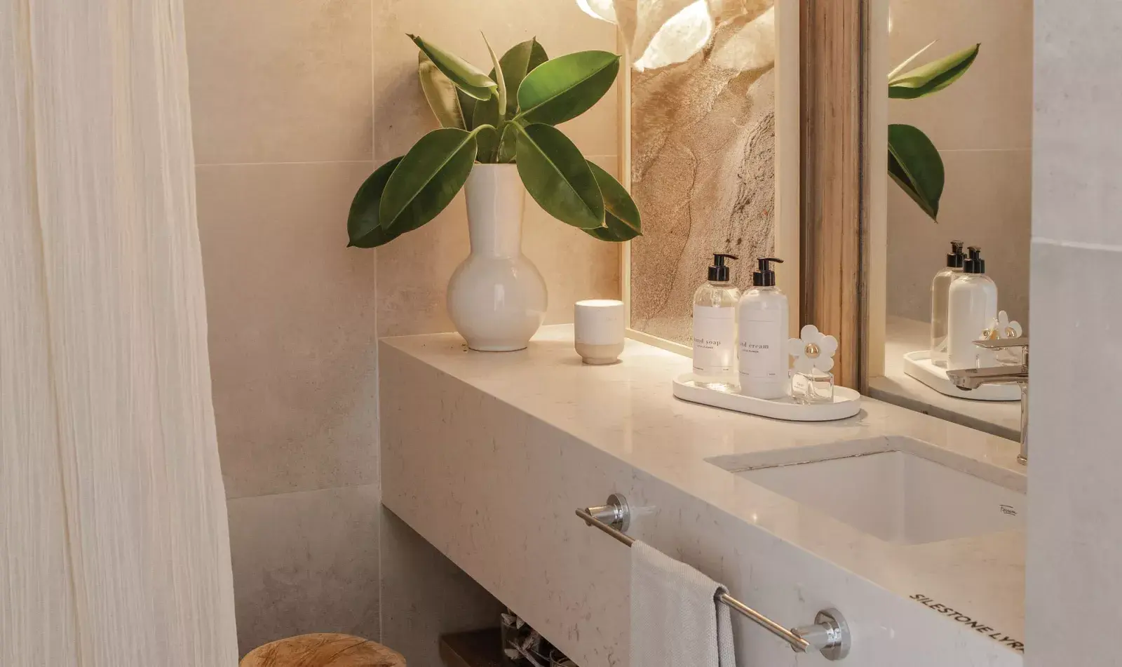 Diseñado por Gabriela Orlando, este baño podría ser parte de una casa de playa o para trasladarse con la mente allí. Para darle esa inspiración, eligió materiales y elementos que remiten a lo natural y su propuesta es que “nada altere la paz interior”, asegura. Optó por una paleta de colores en la gama de los neutros y agregó algunas pinceladas doradas en la deco, como el espejo circular. Como toque fresco, puso un florero con una hoja de Philodendron elegans, que sigue las líneas del diseño de la pared de manera sutil. ¿Un detalle que siempre suma? Tener algunas toallas de mano de nido de abeja sobre la mesada, donde se destacan la bacha Dongio y la grifería de la línea Buzz de Novum en color rose gold.
