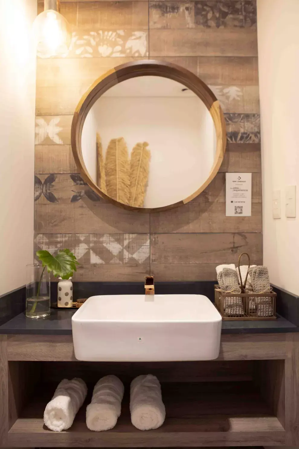 Apatheia, de Josefina Davel y Rosario Carneiro, invita a un momento de pausa en este baño de colores claros y materiales nobles que hablan de la simpleza de lo natural. La dupla eligió cerámicos de la línea Bauhaus, que colocó en piso y paredes para generar continuidad visual. Como tendencia, optaron por una cortina de gasa de algodón que detrás de la mampara esconde un tronco de madera maciza (que funciona como un banquito o espacio de apoyo) y una lámpara de fieltro, para generar luz tenue en un ambiente que busca la calma. Para la iluminación general, usaron un spot led. La madera es también protagonista en el revestimiento junto al espejo que refleja los detalles deco que suman calidez. Además, agregaron un florero con hojas verdes, un cuadro que traslada a una escena tranquila de playa y una bandejita con elementos de baño que añaden diseño. ¡Todo de su marca! “Buscamos transmitir paz con materiales que reflejen simpleza”, aseguran las diseñadoras.