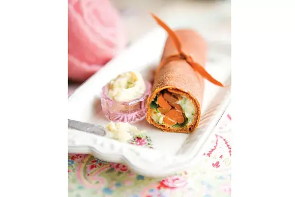 Armar el wrap colocando en la base del pan el hummus (puré de garbanzos), luego las zanahorias y, por último, perejil picado grueso. Finalmente, cerrar y servir. Se puede acompañar con un minidip de hummus extra.