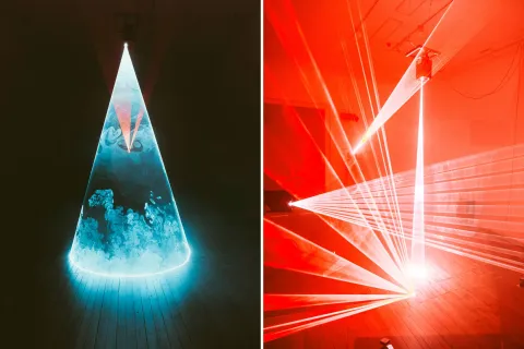 Claustro, un laboratorio experimental de jóvenes de Córdoba, presentó Territorios ilusorios I: un recorrido por atmósferas efímeras y paisajes virtuales, combinando lásers, sonidos y espejos. - Créditos: Gentileza MUTAK.ar/ Mateo Cianfoni