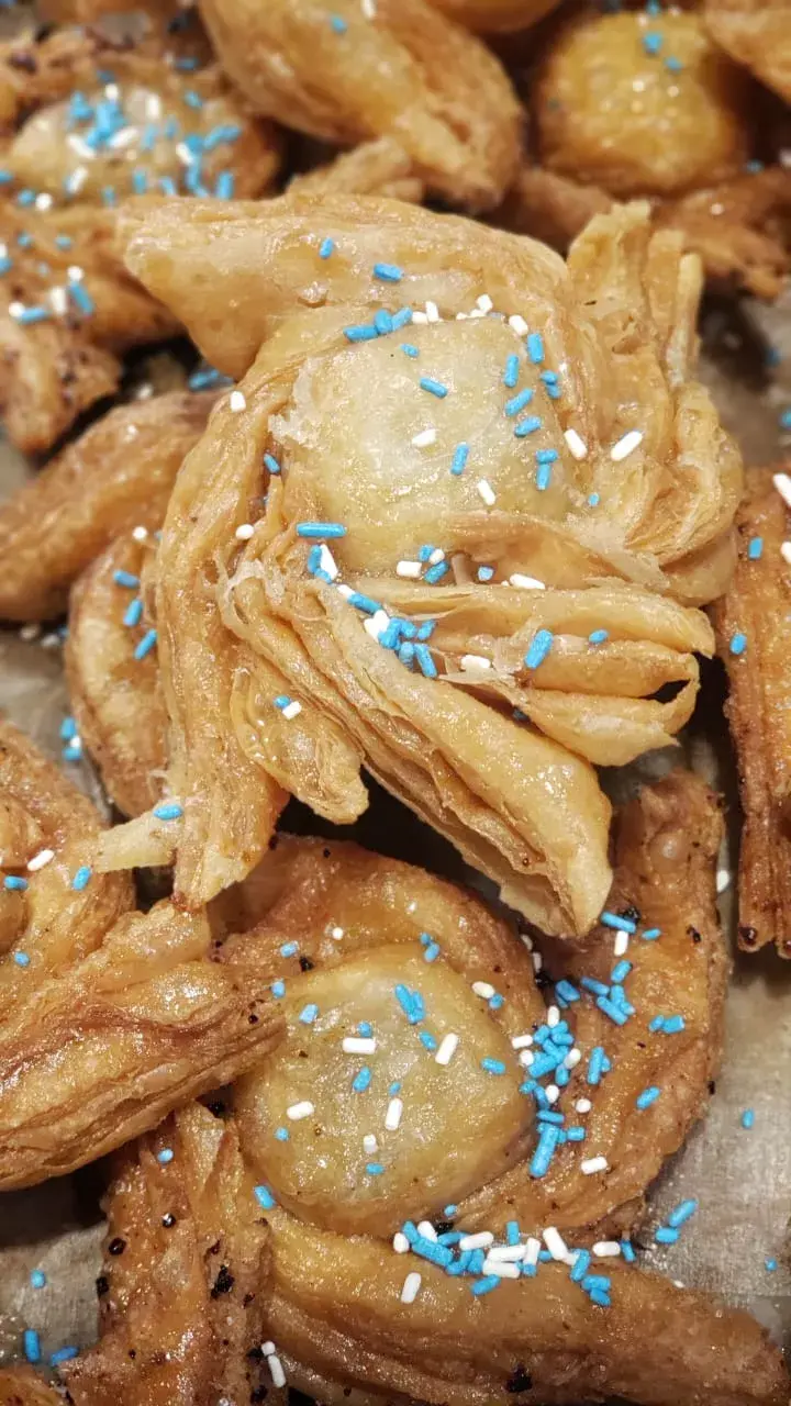 - Para la masa hojaldrada, mezclar los ingredientes en un bol y amasar hasta obtener una masa lisa. Dejar reposar durante 30 minutos a temperatura ambiente. Transcurrido el tiempo, estirar la masa, colocar la manteca del empaste de forma rectangular y espolvorear con el almidón. Realizar una vuelta doble y dejar reposar en la heladera. Luego, retirar la masa, realizar una vuelta simple y dejar descansar nuevamente. Por último, estirar del grosor deseado y cortar en cuadrados de 8×8. Rellenar con cubos de dulce de batata o membrillo y unir las puntas, dándole forma de pastelito o la que más gusten. Cocinar en aceite a 130 °C hasta que se abran todas las capas de hojaldre. Luego, pasar por aceite a 160 °C hasta dorar bien. Escurrir con papel y pintar con almíbar.