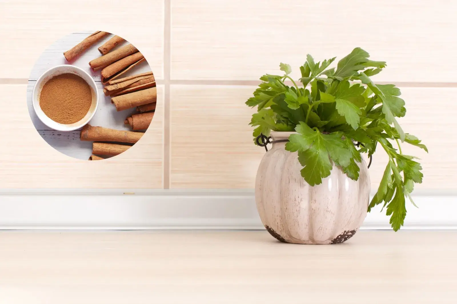 - En un vaso agregá agua y colocá las hojas de perejil y un poco de canela en polvo.