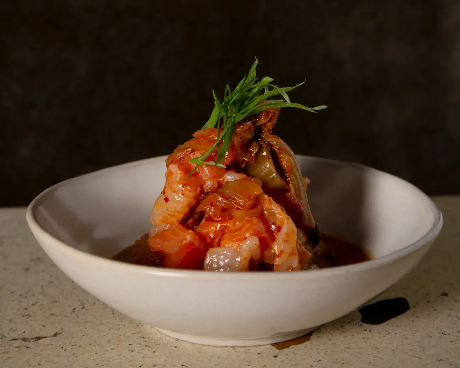 - Norteño: salmón en leche de tigre al ají amarillo, cebolla morada y cilantro, con batata glaseada y canchita.