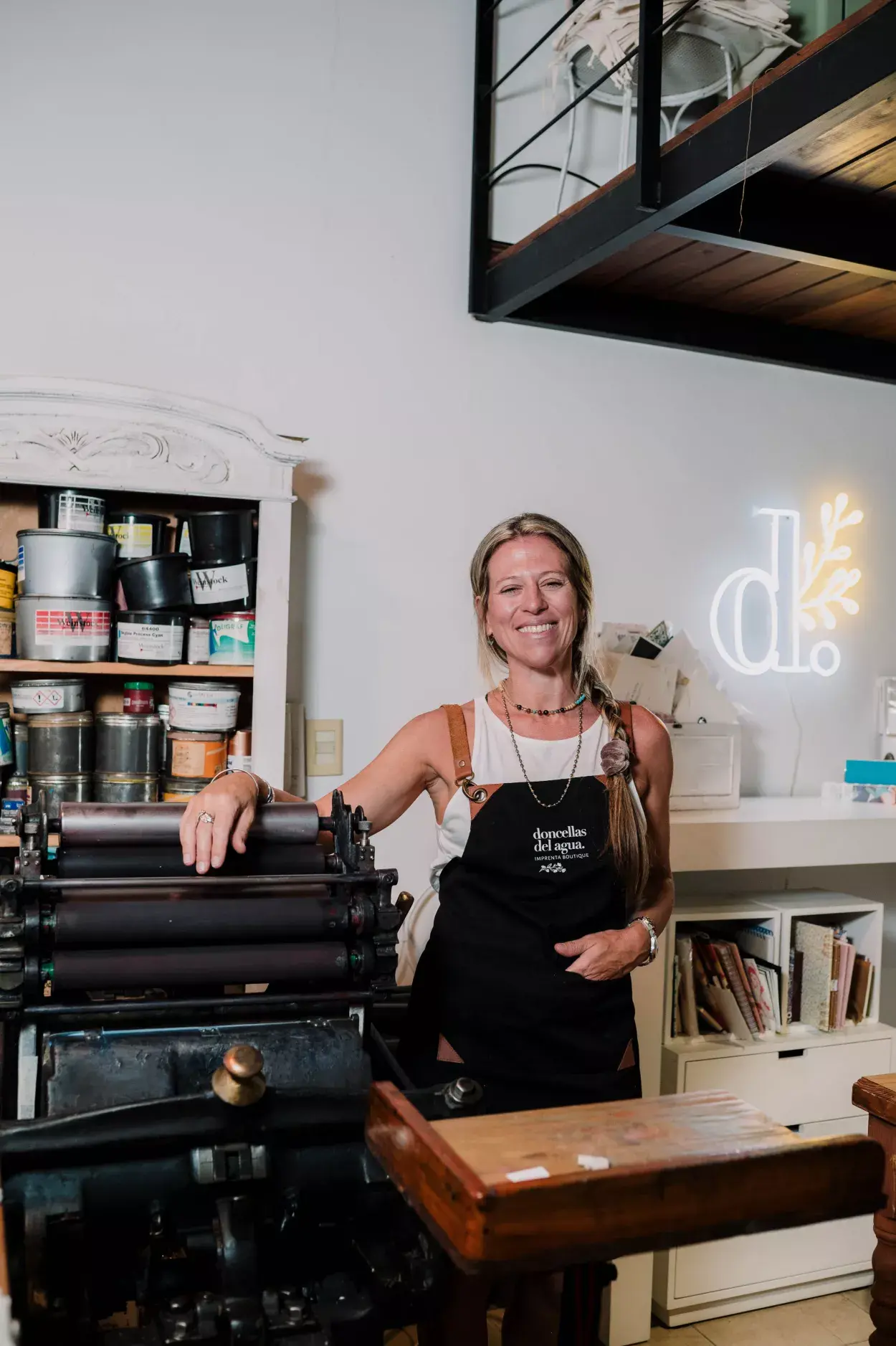 Entrar al taller de Sabrina Poy produce la misma sensación que si nos metiéramos en el ropero de Narnia: meterse en su mundo es deleitarse con los colores, los aromas a tintas y a papel, las texturas, con la armonía y la belleza de los pequeños detalles puestos en cada cuaderno, en cada agenda y en cada tarjeta que desarrolla. Al entrar, te da la bienvenida una máquina de impresión Minerva de principios de 1900, en la que Sabrina revalorizó un antiguo oficio manual como es la impresión, dándole su impronta personal y moderna.