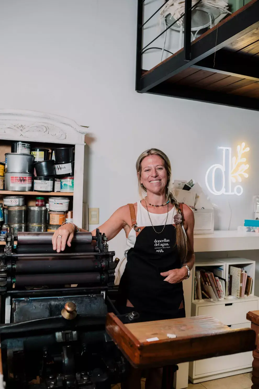 Sabrina Poy, entre sus máquinas antiguas y sus tintas en su taller y showroom de Rosario. - Créditos: Noelia Torres