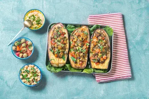 - Agrega el relleno sobre cada rodaja de berenjena y tapa con otra rodaja, rocía aceite de oliva y perejil.