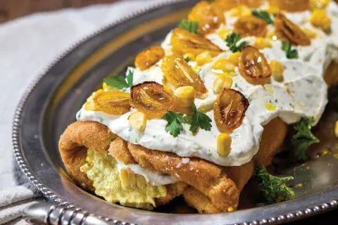 Por fuera, agregar un poco más de queso blanco con hierbas, tomates cherry, hojas de perejil y más choclo.