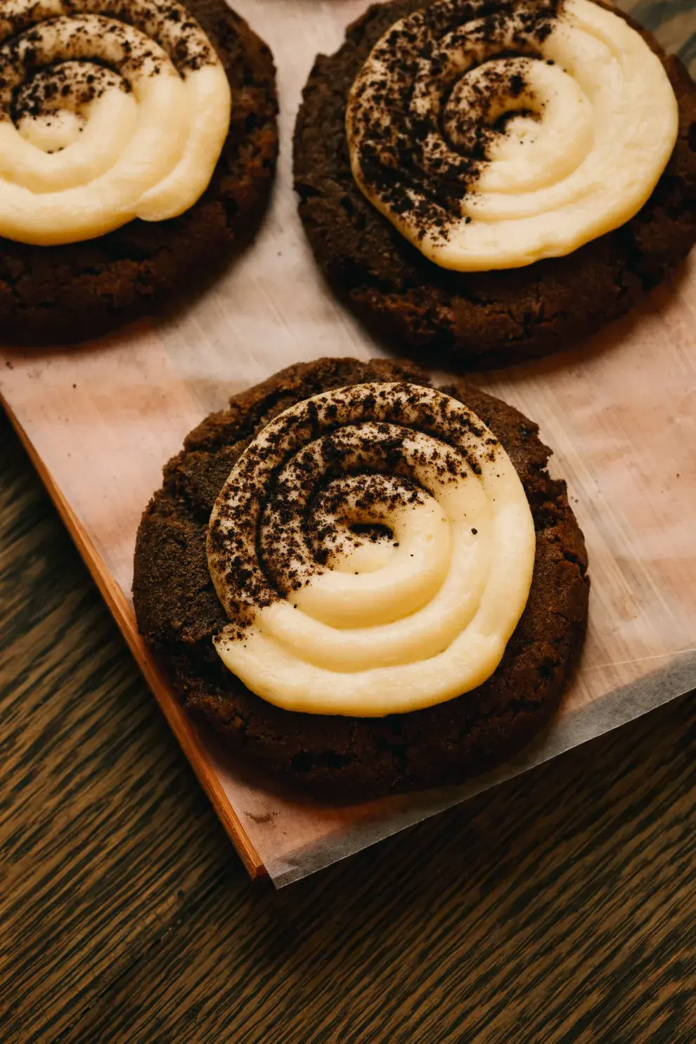 - Batir el mascarpone con la vainilla, el azúcar impalpable y la crema hasta que se formen picos firmes. Pasar a una manga, decorar la superficie de las cookies y espolvorear con cacao.