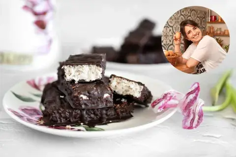 Primero tenés que mezclar el coco rayado con el endulzante y el yogur. Los tres ingredientes tienen que conformar una pasta pareja. Luego, tenés que poner la preparación sobre un papel manteca y darle a la pasta una forma bien compacta. Llevar al congelador por cuarenta y cinco minutos. Una vez que testé bien fría, derramar chocolate derretido por arriba y volver a enfriarlo en la heladera hasta que quede bien firme. ¡Y listo!