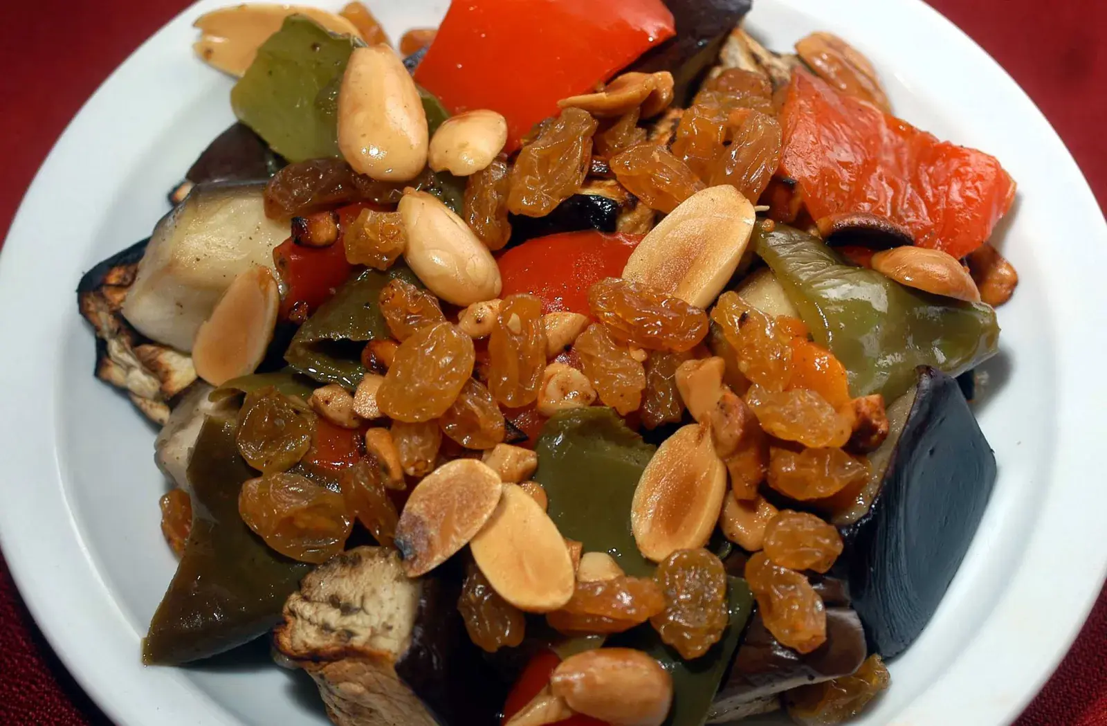 Mezclar las berenjenas y los morrones ya asados y servirlos fríos con un puñado de frutos secos.
