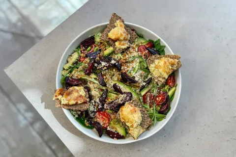 3. El toque gourmet: incorporá el halloumi dorado (podés grillarlo para potenciar su sabor) y la palta en láminas.