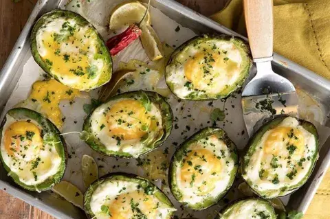 4. Agregar el huevo en el hueco y colocar en una placa apta para horno. Realizar lo mismo con cada palta.