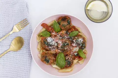 Agregar la salsa de tomate. Integrar. Emplatar la pasta con salsa, las albóndigas y terminar con queso rallado, aceite de oliva y albahaca fresca.