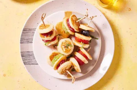 Para servir, tomar un palito de brochette e ir alternando un mini pancake con una fruta de estación.
