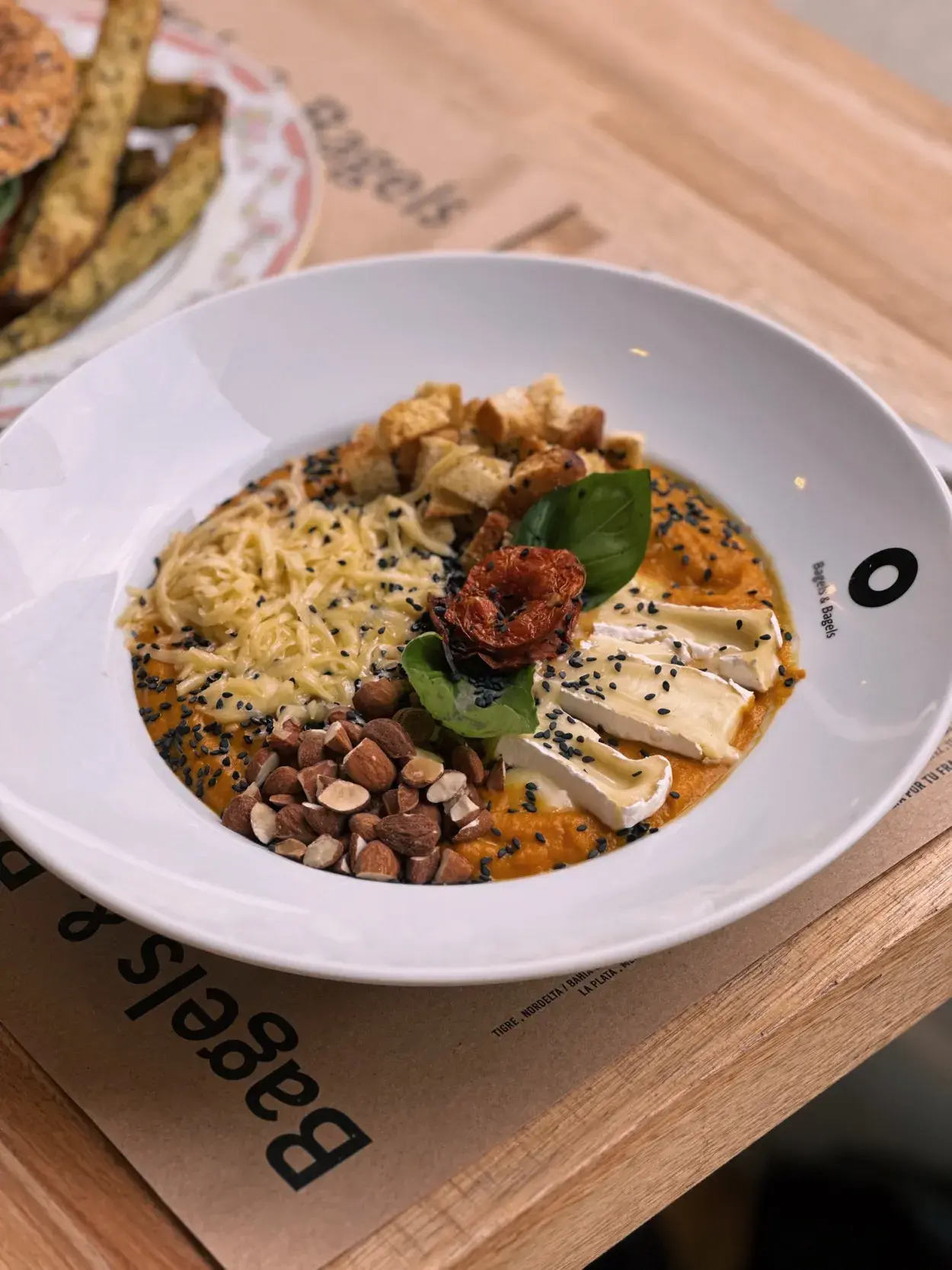 - Servir caliente y, si querés replicar la versión de Bagels & Bagels, sumar toppings como queso brie, tomates asados, croutons, albahaca fresca, almendras tostadas y queso tybo.
