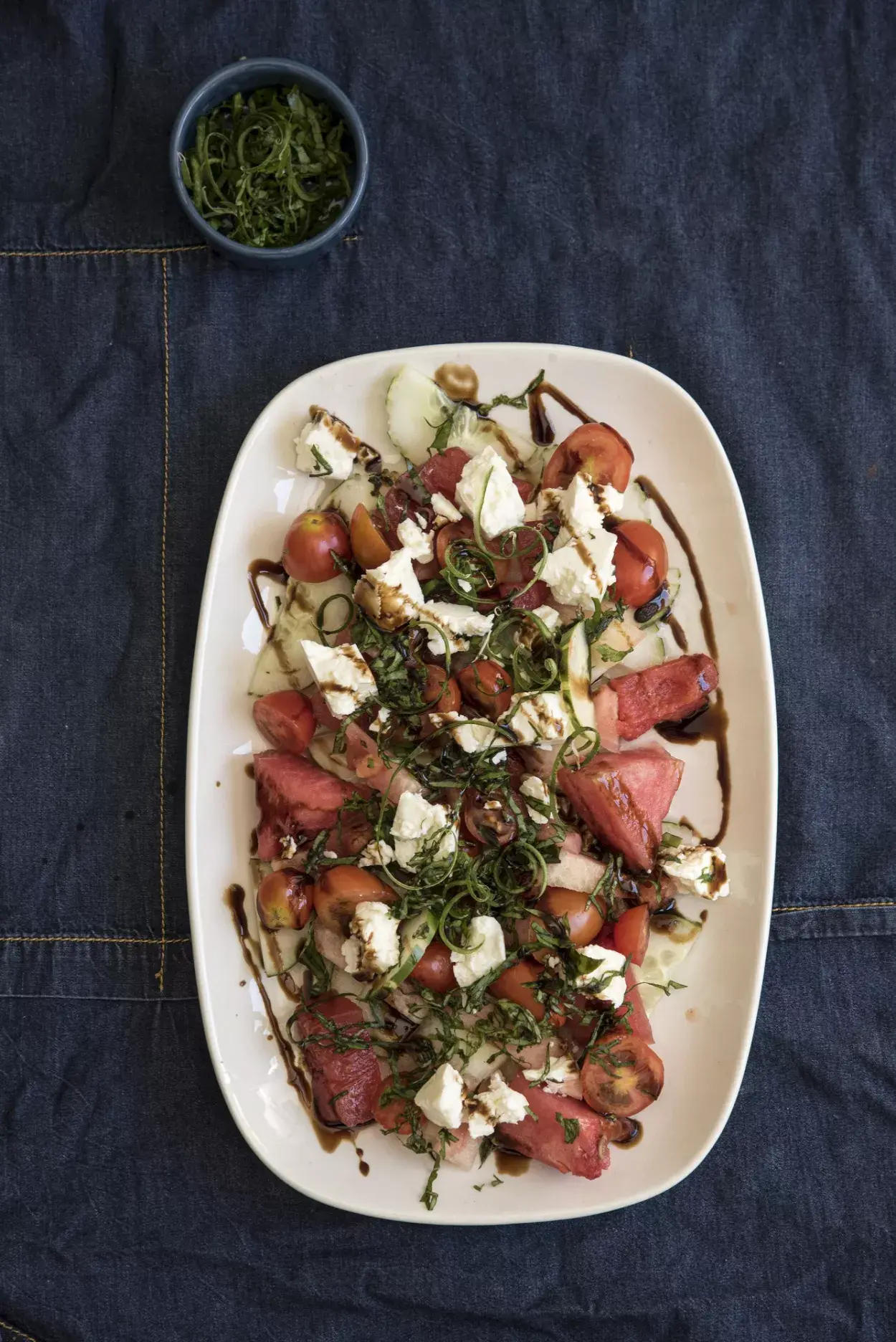 - Luego, en una fuente plana para ensalada, preferentemente, colocar los tomates en la base, seguir con la parte blanca y la parte rosa de la sandía, cubrir con los pepinos cortados y reservar en la heladera.