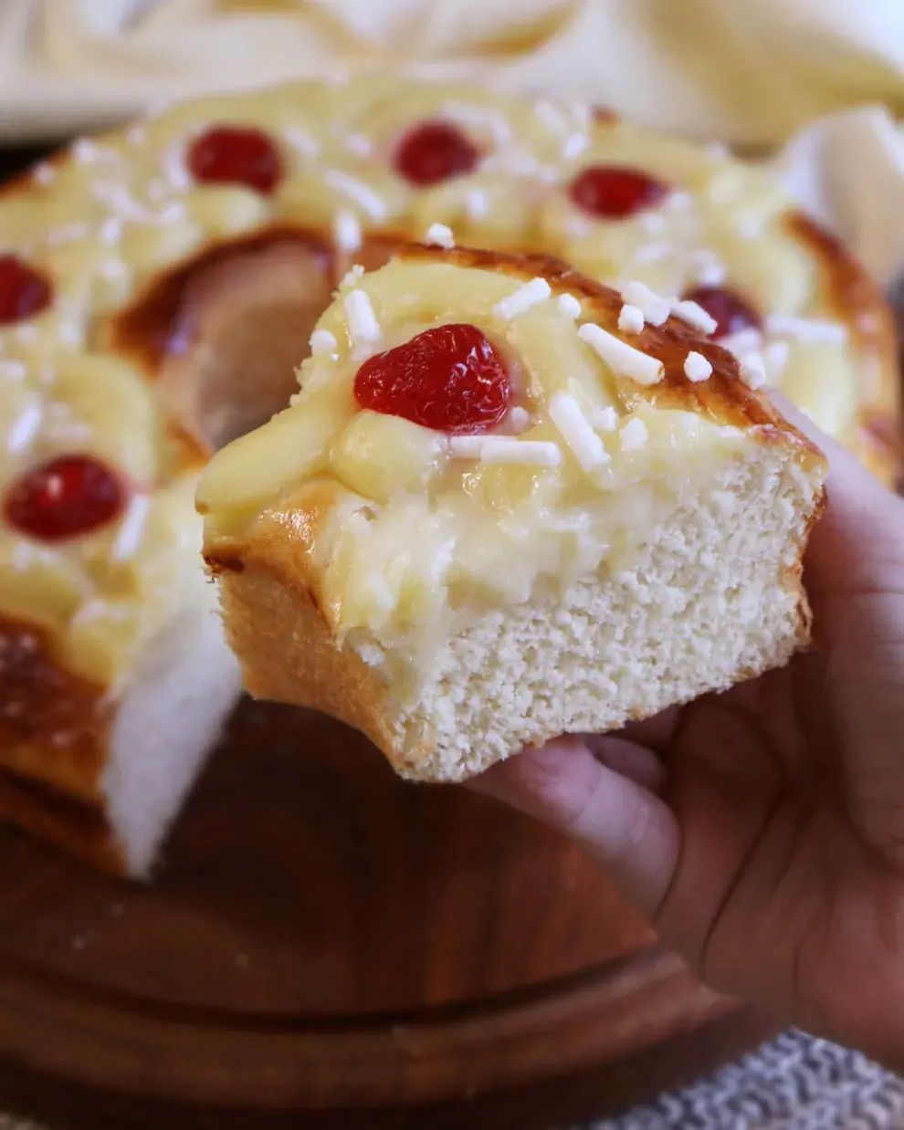 Una vez que la masa crece, pintar con huevo toda la superficie. Luego decorar con Crema Pastelera, utilizando una manga hacer un "zigzag" todo alrededor de la rosca y sumar las cerezas confitadas y el azúcar granulada o “granella”.