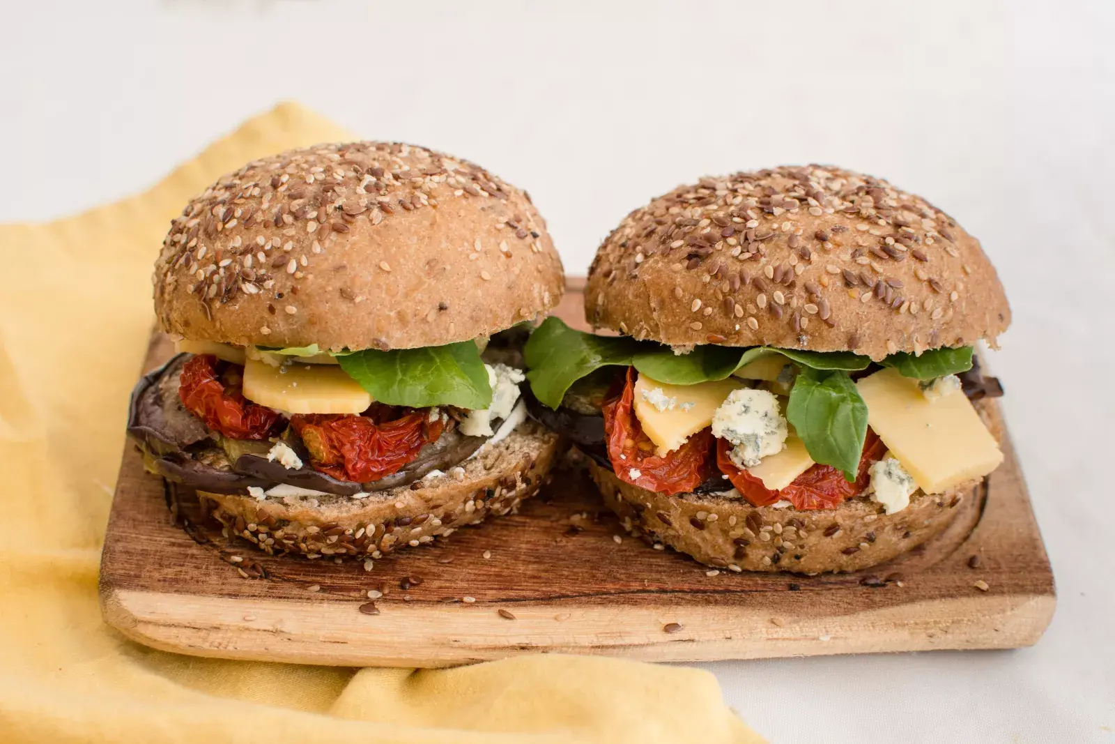 Hoy una receta exprés, para hacer unos sándwiches fáciles pero con una vuelta de tuerca. Podés reemplazar las berenjenas por otras verduras grilladas: zucchinnis, zanahorias o lo que tengas en casa.