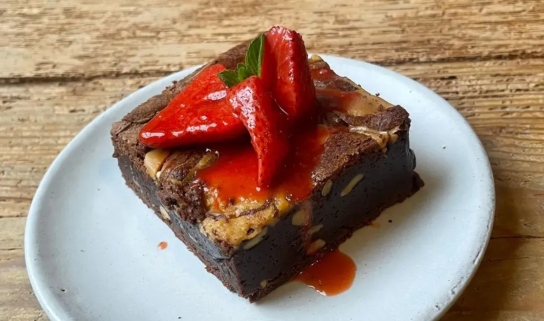 Una versión sofisticada del brownie tradicional, enriquecida con maní tostado, pasta de maní y frutillas horneadas en jugo de naranja.