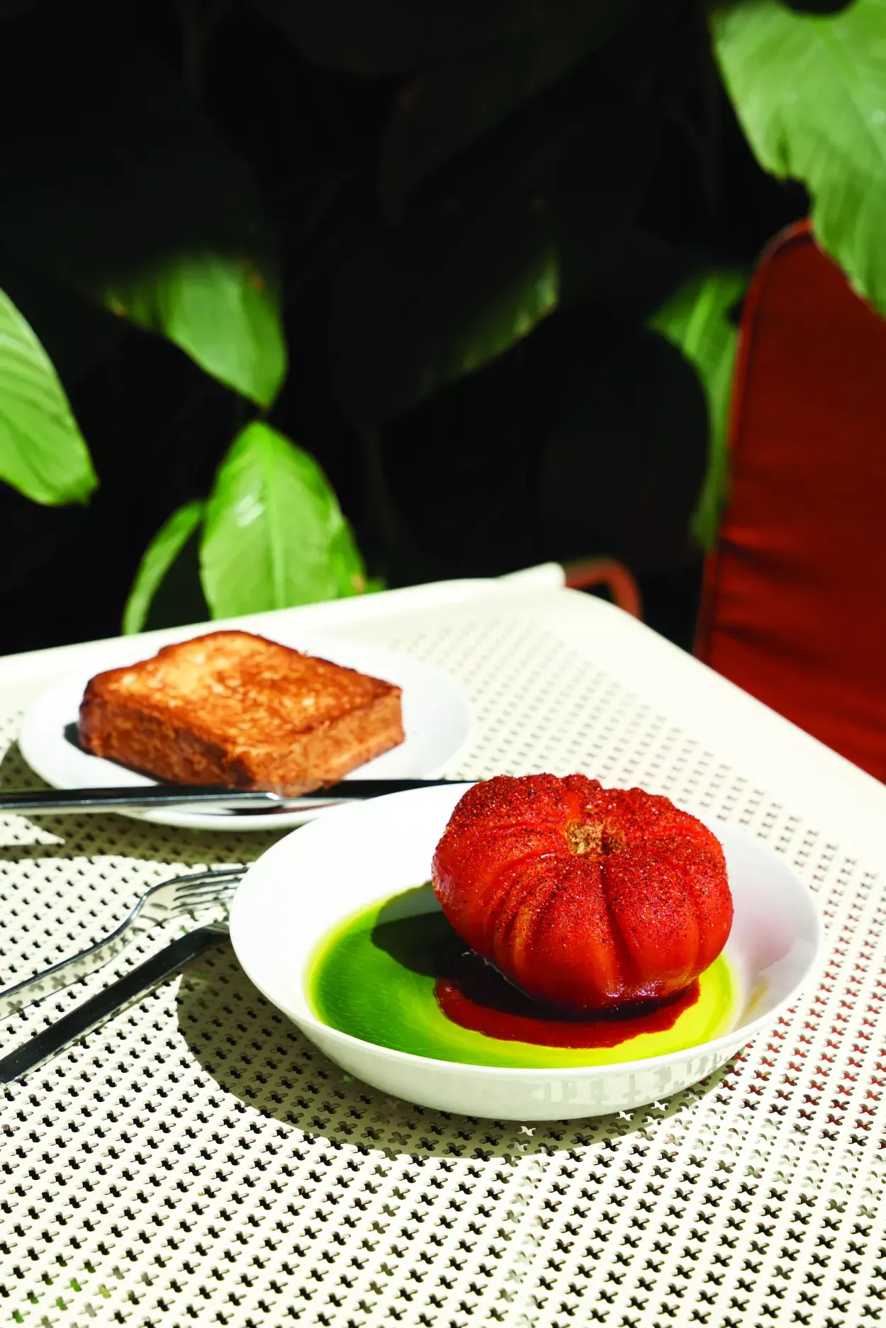 Para la reducción de sandía, licuar la sandía sin semillas y ponerla en una olla a fuego mínimo. Reducir la preparación hasta obtener una textura similar a la de una mermelada. Emplatar poniendo en la base del plato el aceite de oliva, luego el aceite de albahaca, luego la reducción de sandía y por último el tomate pelado. Terminar con sal y pimienta.