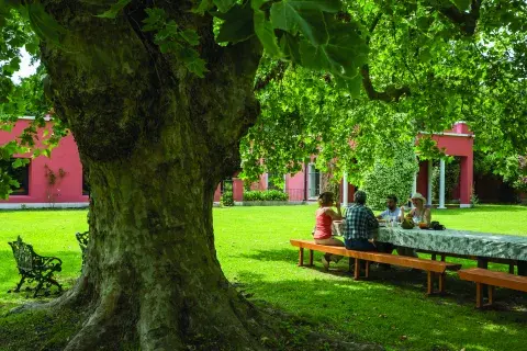 Al cruzar la tranquera, ya se percibe el aire de campo. Ves las aves, los potreros agrícolas y las pasturas hasta llegar a la casa principal, con una magnífica arboleda. De estilo colonial, cuenta solo con 5 habitaciones. Tiene pensión completa con platos tradicionales e ingredientes frescos de la propia huerta. Hay pileta, masajes y cabalgatas.