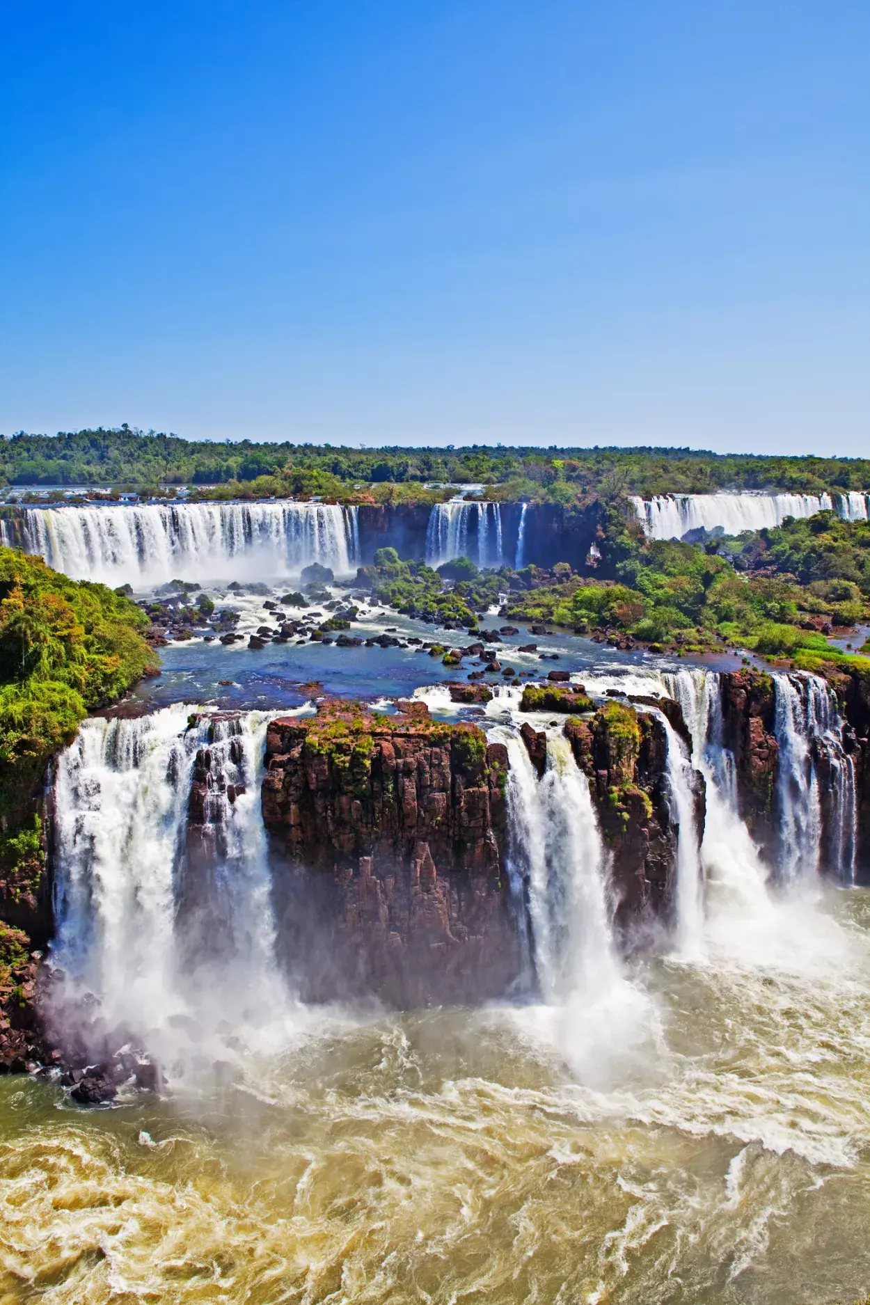 Garganta del diablo. Esta es la caída de agua más popular del Parque Nacional. Cuando ingresás por el Centro de Visitantes, la entrada principal, vas a poder subir al Tren Ecológico de la Selva, que te lleva sin escalas hasta su última parada: la Garganta del Diablo. El trencito es de color verde (haciendo juego con su entorno) y los vagones son abiertos para que puedas ir admirando (y respirando) todo ese aire puro de la naturaleza que te rodea. Una vez que bajás, comenzás una caminata de 1100 metros por una pasarela sobre el río Iguazú hasta llegar al destino final: el balcón. De lejos ya se siente la bruma, saltos de más de 150 metros de longitud con una caída de más de 80 metros de altura..., ¡es como un edificio de 30 pisos! Los saltos forman una “U” y el agua corre con un caudal de 1500 metros cúbicos por segundo (¡wow!). Podés quedarte a admirarlas todo el tiempo que quieras; eso sí, andá preparada para mojarte porque, si sopla viento a favor, ¡te vas a empapar!