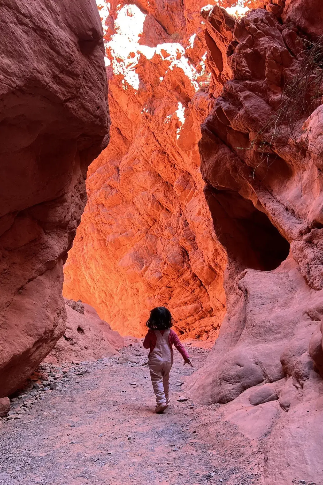 La imponente quebrada intenta distraer la marcha del grupo con sus diversos tonos, entre ellos el rosa, rojo, naranja, violeta y gris. De golpe el sendero se interrumpe ante un paredón rojizo e imperfecto direccionando hacia una pequeña cueva. El guía invita, de forma voluntaria y con sumo cuidado, a ingresar al portal. Lo que era un trekking a cielo abierto se transforma en una escena de Stranger Things.