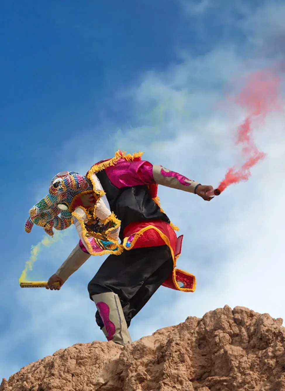 Una de las máscaras del "Diablo" del Carnaval de Uquía con coloridas bengalas durante las "Bajadas del Diablo", provincia de Jujuy, Argentina. - Créditos: Prensa