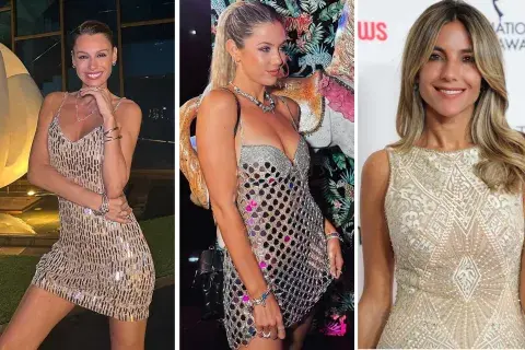 Pampita eligió un vestido corto con escote pronunciado en V, breteles con detalle de pedrería bordada a mano, de Monofuck. El diseño además contaba con pedrería plateada a lo largo de todo el diseño lo que le daba un efecto shiny alucinante. Para completar su outfit sumó sandalias de taco XL y plataforma, metalizadas. Quien fue de la partida con un look similar, ya que también se encuentra realizando el mismo viaje fue Juli Poggio. En este caso, la influencer optó por una blusa de manga larga en color nude con grandes lentejuelas en color dorado lo que le dio un upgrade al conjunto conformado por una falda con volados en color negra.