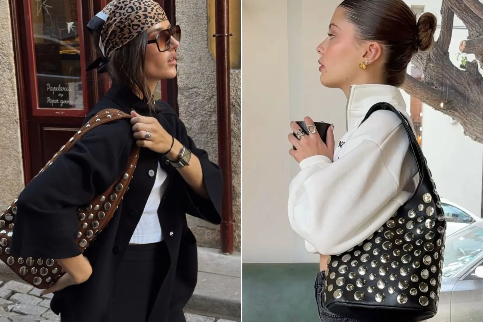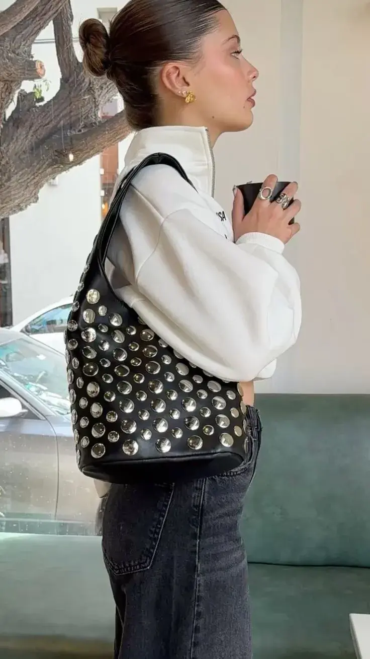 En las calles, las insiders ya los adoptaron como comodín: funcionan igual de bien con jeans y remera blanca que con vestidos, trajes sastreros o conjuntos monocromáticos. La clave está en el contraste: sumar un bolso con tachuelas es una forma simple de darle fuerza y personalidad a cualquier outfit.