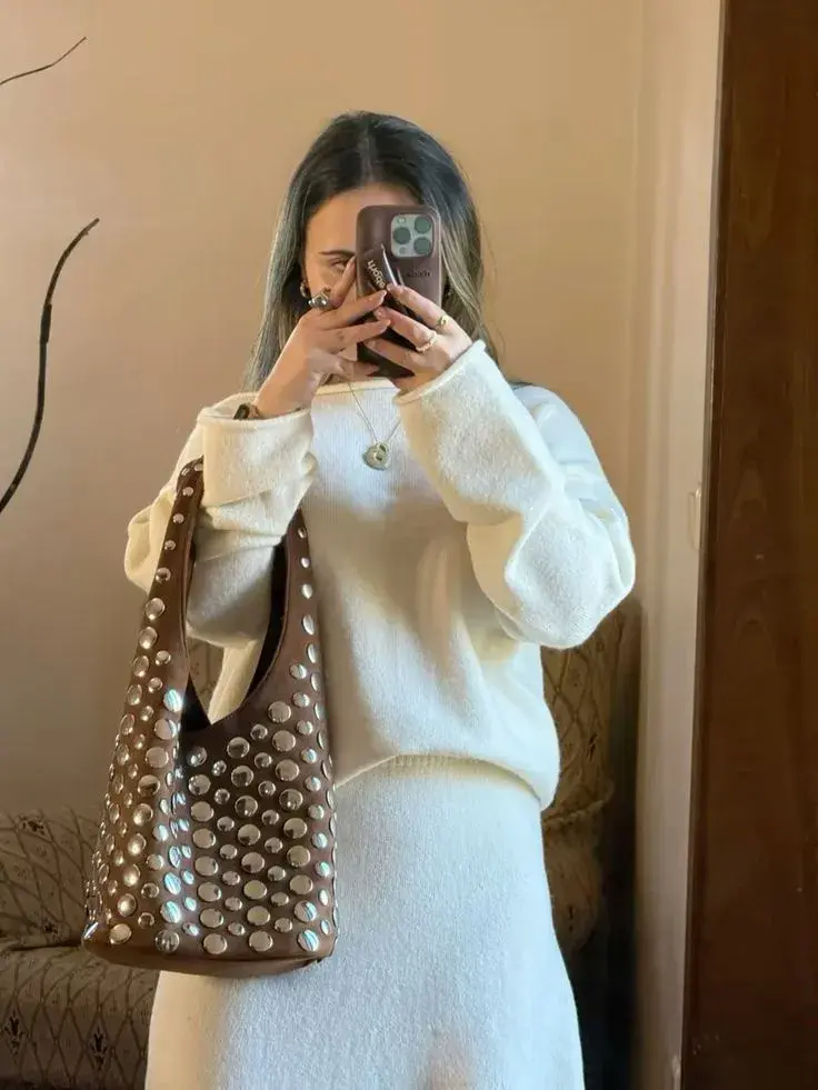 Uno de los grandes aciertos de esta tendencia es su capacidad para adaptarse a distintos estilos y edades. En looks más clásicos, un bolso con tachuelas aporta frescura y un aire moderno inmediato. En estilismos más relajados, suma actitud y ese toque cool que transforma lo simple en especial.
