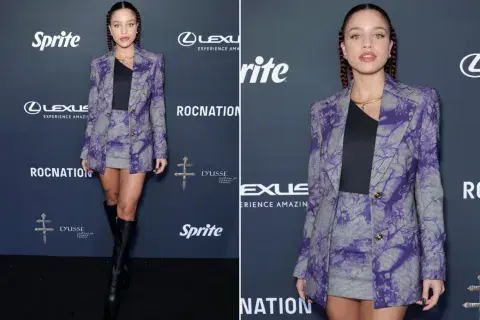 Se trata de un traje de blazer y falda con estampa en tonos grises y violetas, combinado con una remera negra de un solo hombro y unas botas de caña alta a tono.