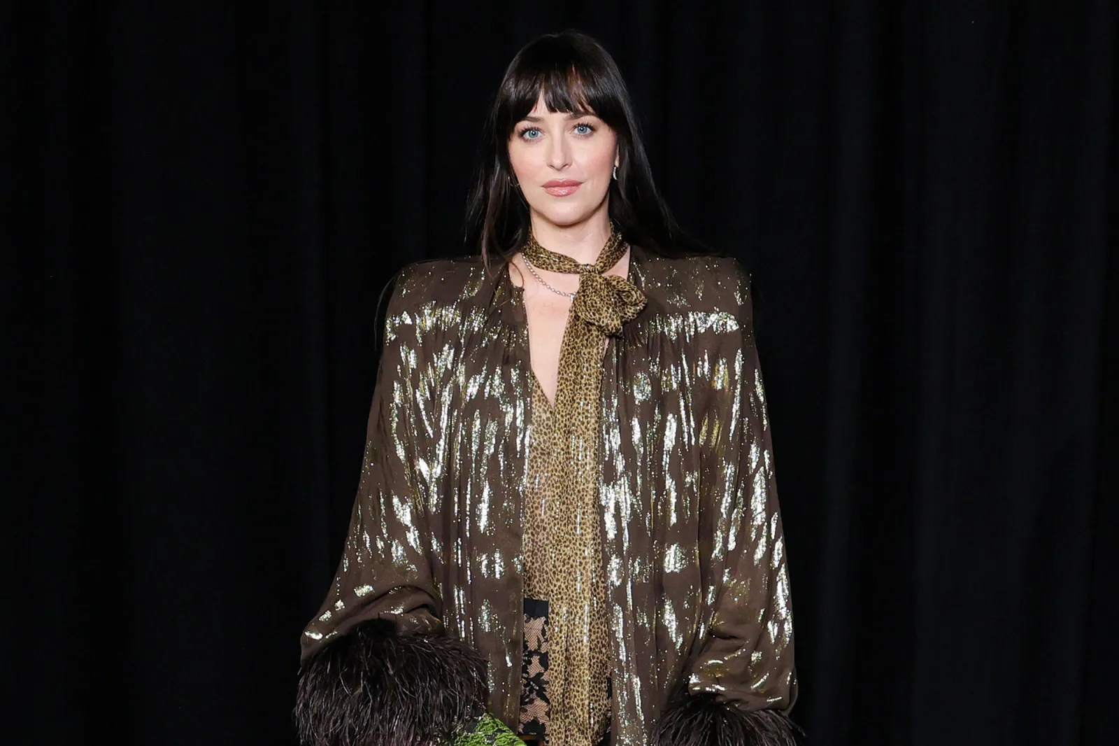 Johnson combinó una blusa con estampado de leopardo y lazo largo al cuello con una chaqueta abierta en tonos cafés y detalles en dorado - Créditos: Getty images