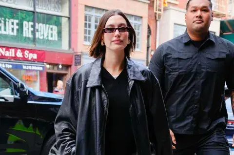 Hace no mucho habíamos visto a Kendall Jenner imponiendo tendencia con sus no-pants, movida a la que ahora se sumó una de sus mejores amigas, Hailey Bieber. Fotografiada caminando por las calles de Nueva York, su outfit nos recuerda al de Kendall pero -al mismo tiempo- lo imprimió de su impronta personal: con una campera de cuero ovesize y bien noventosa, abajo tiene un jersey con cuello en V (con, lo que parece, una remera blanca que apenas se ve), medias traslúcidas negras y... por supuesto, sin pantalones.