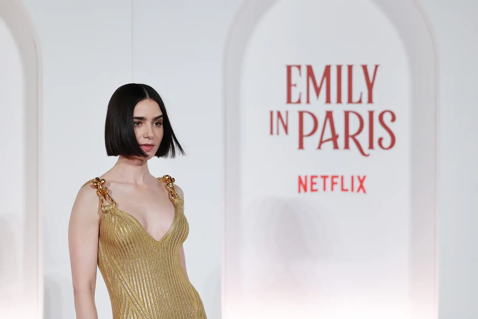 La premiere en Roma de los nuevos episodios de Emily in Paris sirvió para que Lily Collins deslumbre con un glamoroso look dorado.