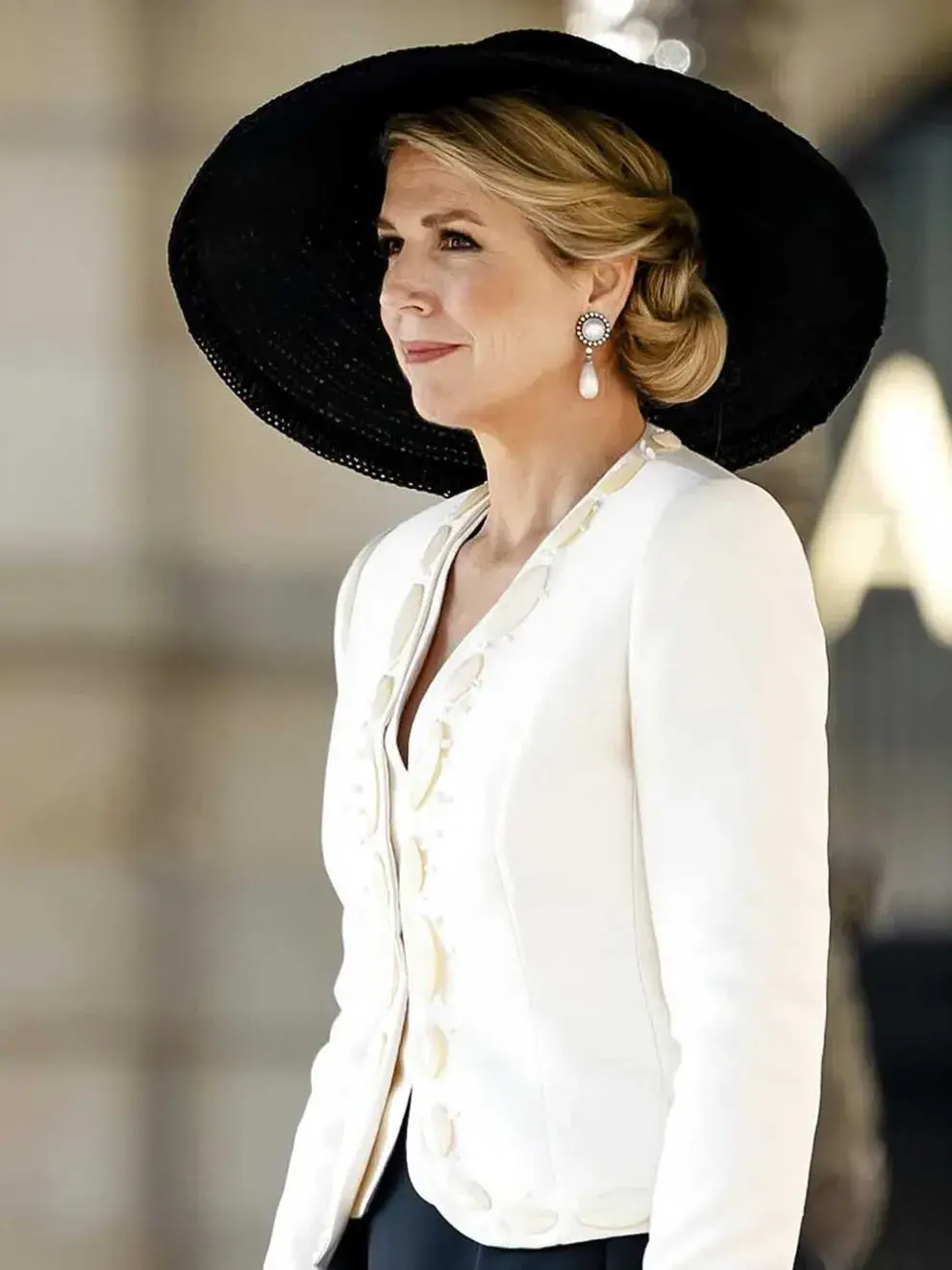 Para esta ocasión tan especial y de la mano de un estricto protocolo la reina de los Países Bajos eligió una propuesta de inspiración "New Look". El equipo compuesto por una chaqueta blanca sin solapas con incrustaciones de piedras de formas irregulares más una falda de color negro con vuelo y corte midi logró acaparar la atención de los amantes de la moda. Pero esto no fue todo. El outfit siguió con una pamela de rafia negra, uno de los accesorios favoritos de Máxima que, además, en este conjunto quedaba a la perfección.