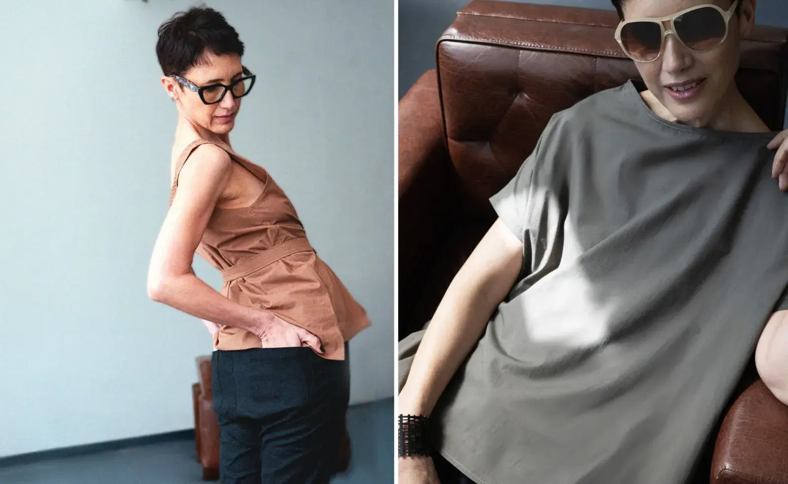 A partir de estas reflexiones surgen versiones de una misma prenda. Por ejemplo, un pantalón que admite customizar las babuchas con un botón, o un vestido que envuelve el cuerpo con sus tiras o, todo lo contrario: “liberándolas te encontrarás con una nueva forma que no sabías que podía gustarte, que no sabías que podía ser otra opción. En ese descubrir hay algo también de lo que quiero transmitir y es esa oportunidad de jugar, de ser curiosa y cambiar. No importa la edad”, subraya Grinstein. Para acompañar las líneas despojadas y destacar la moldería que juega con la simetría y asimetría, la diseñadora busca géneros lisos. “Ya estoy explorando prendas con algunos procesos como foil o engomado”, anticipa.