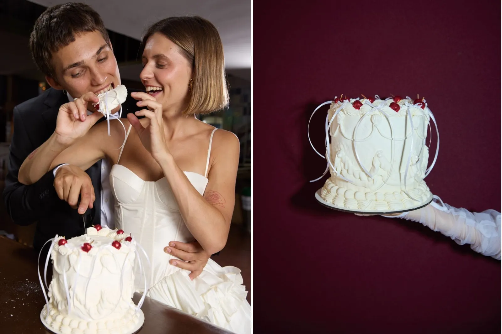 VALENTINA: VESTIDO ODETTE (VENUS DE ARLES), AROS (POSH JOYAS, $19.990). TOMÁS: TRAJE Y CAMISA (TASCANI, $395.000 Y $140.250), TORTA CON MOÑOS (AGUS VIVES BAKES). - Créditos: Anahí Bangueses
