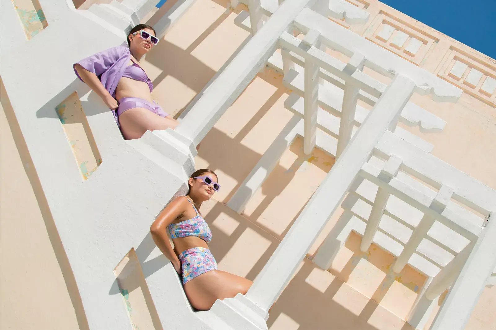 Zoe: Anteojos (Hardem, $34.500), bikini y biker (Amatista, $17.000 y $8000), collares (Rita C, $3050 Y $3700), sandalias (Birkenstock, $41.099), bolso de red (Compañia de sombreros, $11.850). Cotu: anteojos (Chita, $6100), traje de baño (Amatista, $20.000), bolso de red (Compañía de sombreros, $11.850), sandalias (Why Donna, $26.900). - Créditos: William Kano