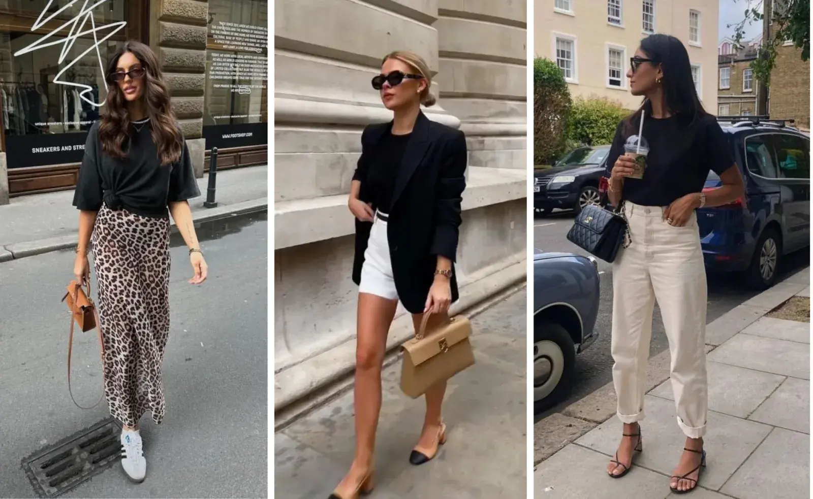 Combiná tu remera negra de algodón con un pantalón sastrero beige, blanco o un jean claro. Agregá unas sandalias de cuero y un bolso estructurado para un look elegante y profesional. Para días de altas temperaturas elegí bermudas, son la prenda de la temporada, son frescas y cancheras.