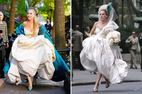Si recuerdan bien, Carrie y Mr. Big deciden casarse con una celebración íntima pero -al hacer el anuncio y gracias a la enorme fama de la periodista- ese pequeño casamiento creciendo al punto en que la protagonista, mientras hace una producción y se prueba diferentes vestidos, se enamora perdidamente del diseñado por Vivienne Westwood.