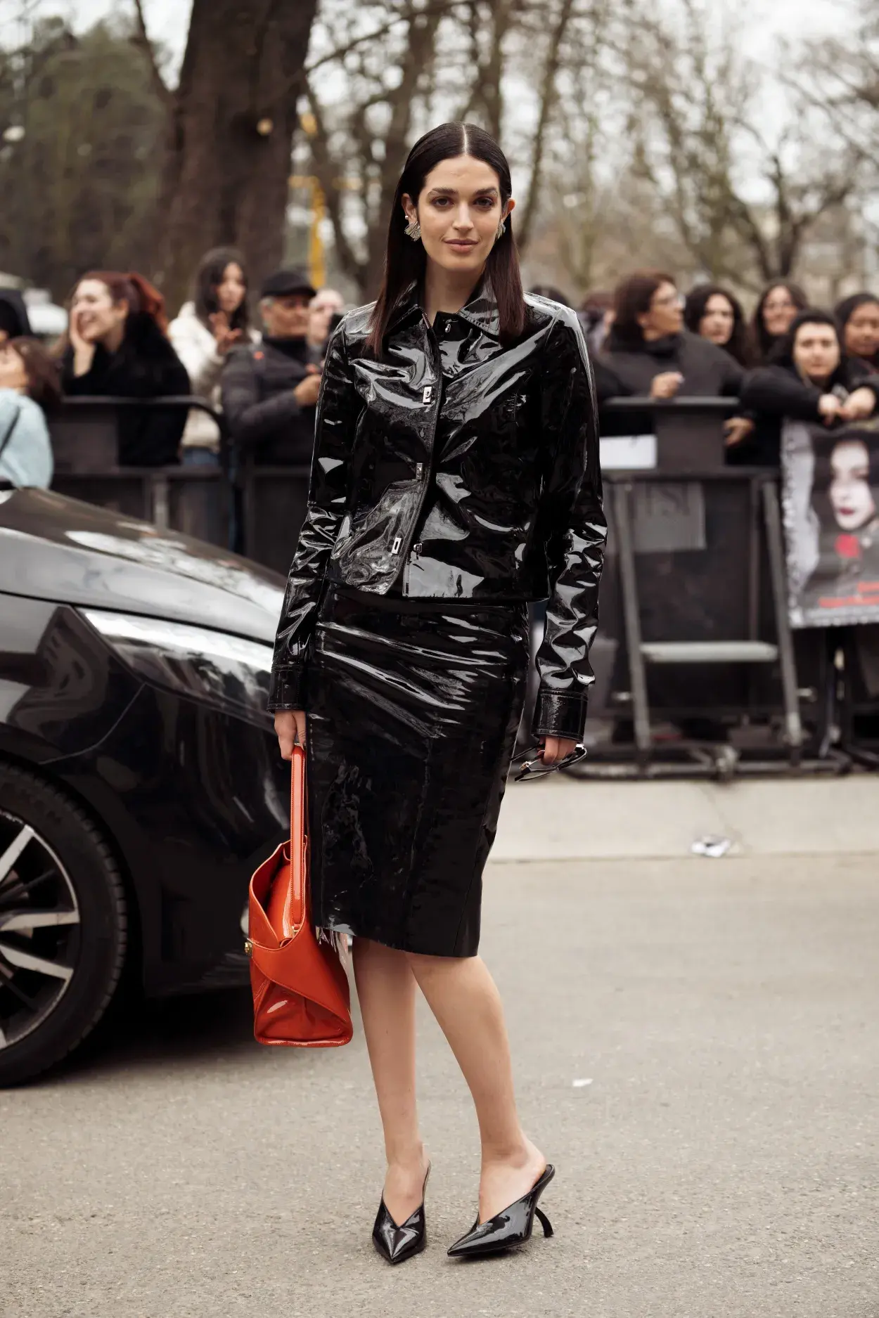 El layering ayuda a bajar la intensidad del brillo. Un tapado clásico, una campera de cuero o incluso un blazer estructurado pueden transformar una falda de charol en una prenda apta para el día. La idea es que el charol no sea el único protagonista del look, sino parte de un conjunto equilibrado.